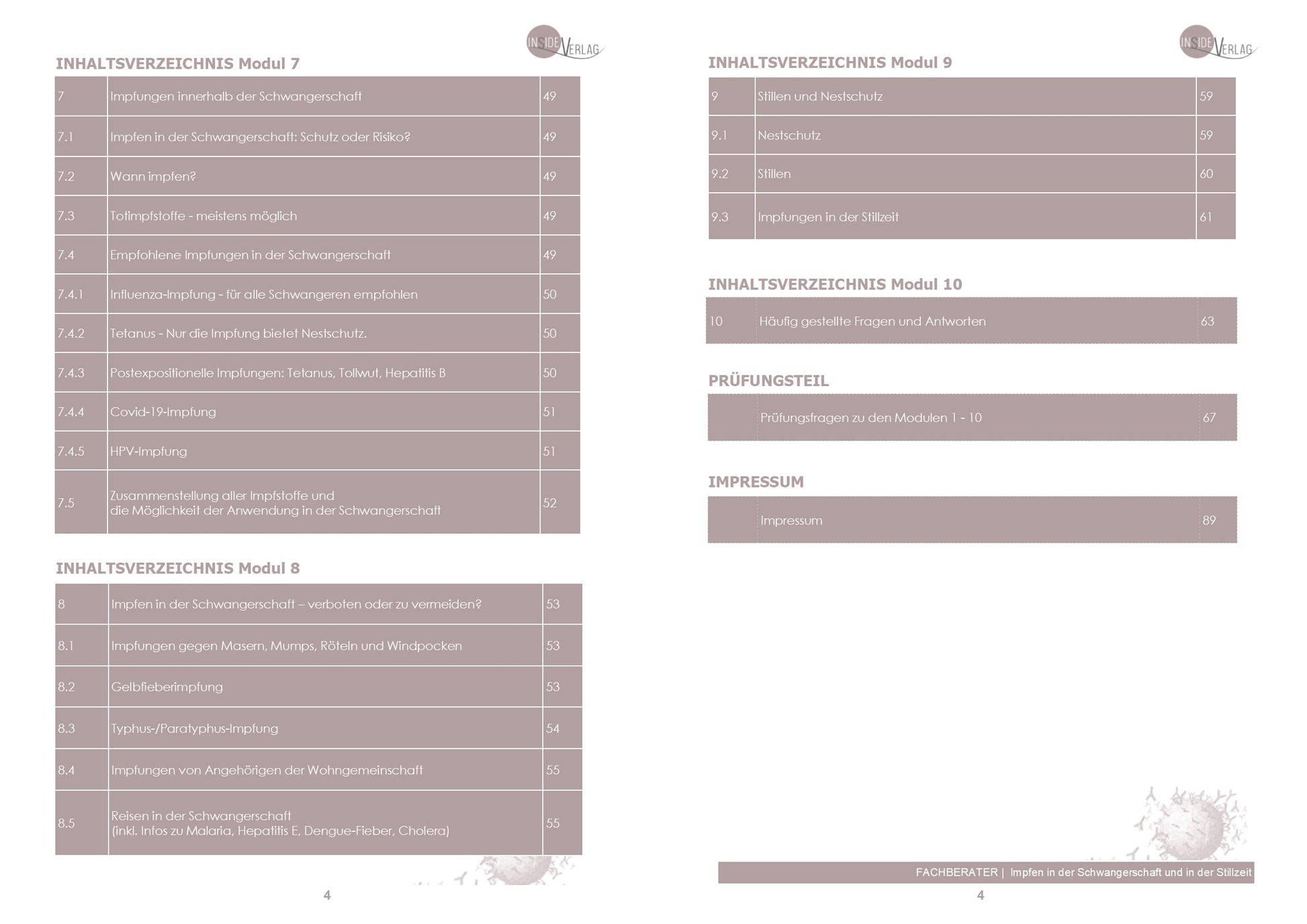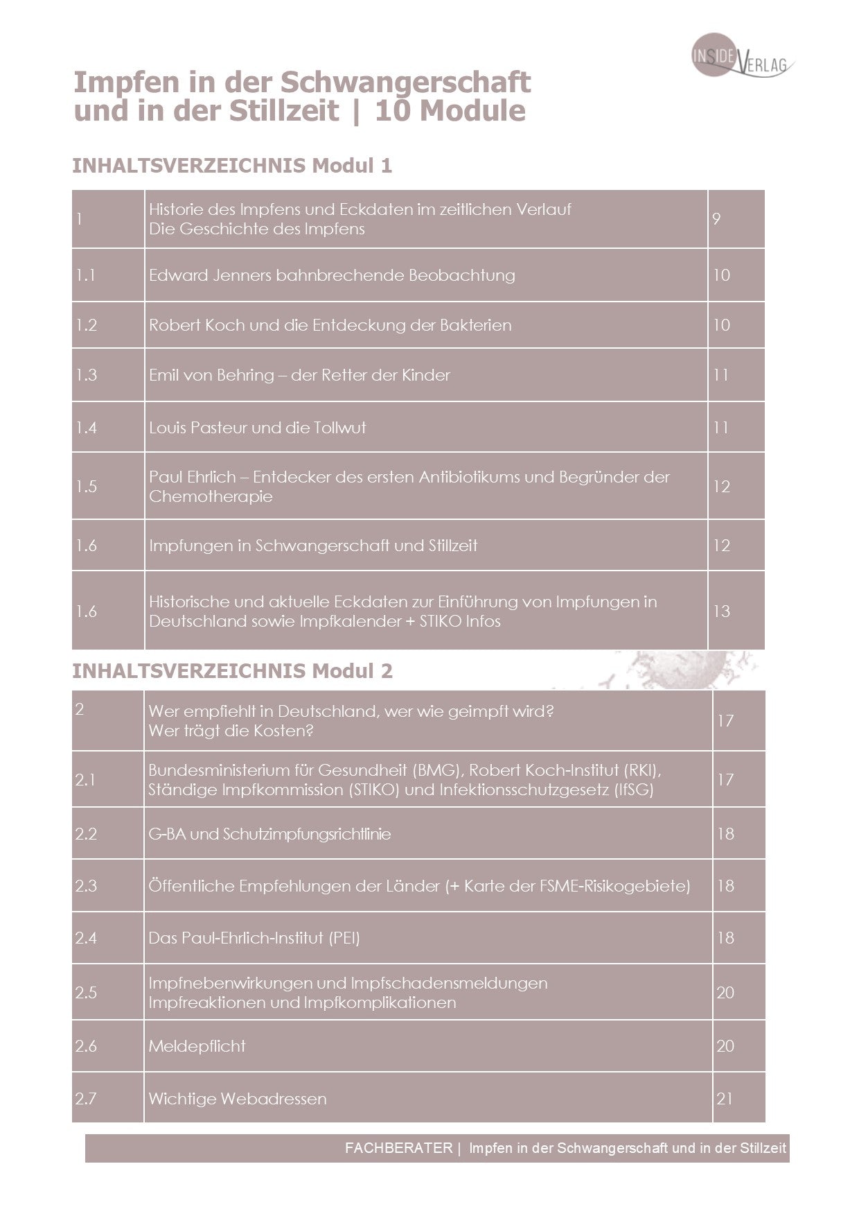 Diese Fortbildung enthält die Inhalte der Fernfortbildungen Schwangerschaft, Stillzeit, Wochenbett Teil 1 (Basiswissen), Teil 2 (Beschwerden), Teil 3 (Säuglings-, Kinder- und Jugendgesundheit) und Teil 4 (Impfen in der Schwangerschaft).